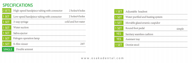 تخصيص أنابيب قبضة عالية السرعة مع موصل 2 فتحات / 4 فتحات 2 مجموعات أنابيب قبضة منخفضة السرعة مع موصل 2 فتحات / 4 فتحات 1 مجموعة 3 حقنة حقنة باردة وساخنة 1 SET مجموعة شفط الماء 1 قاذف اللعاب 1 مجموعة مصباح تشغيل هالوجين 1 SET عارض أفلام X 24V 1 SET مسند للرأس قابل للتعديل 1 SET تنقية المياه ونظام التدفئة 1 SET متحرك الزجاج / السيراميك cuspidor 1 SET دواسة القدم المستديرة بسيطة 1 SET وسادة ملحومة صحية نعم الدرج المساعد نعم ذراع مزدوج كرسي طبيب الأسنان 1 SET